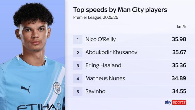 - 时速35.98km,奥赖利创造曼城本赛季最快冲刺速度
